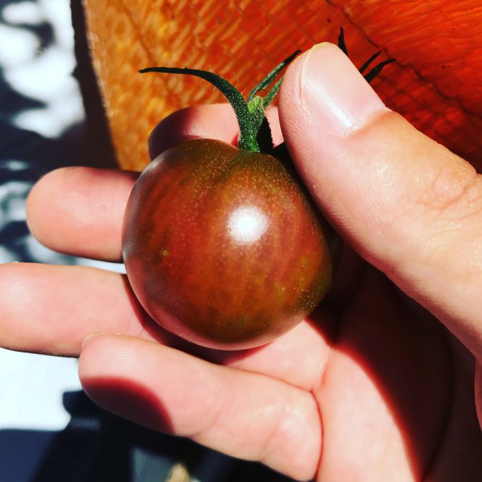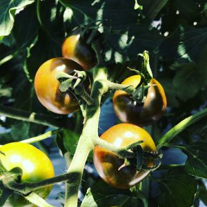 ソバージュのトスカーナ ソバージュ栽培で栽培している紫のミニトマト、トスカーナバイオレットが少し遅れて遂に着色しだしてきた。 肩まで着色する完熟までもう少しか。 この先の天気で一気に色付きそう。 これが、プリップリで、巨峰みたいでウマいんだよね。