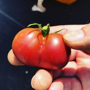 トマトの誘惑 oh! ナイスヒップ! そんな事をおもむろに声に出してしまいそうになる程見事な曲線美。 ソバージュ栽培の紫のミニトマト、トスカーナバイオレットの中にとてもグラマラスな個体が出現。 お尻フェチには堪らない一品である。