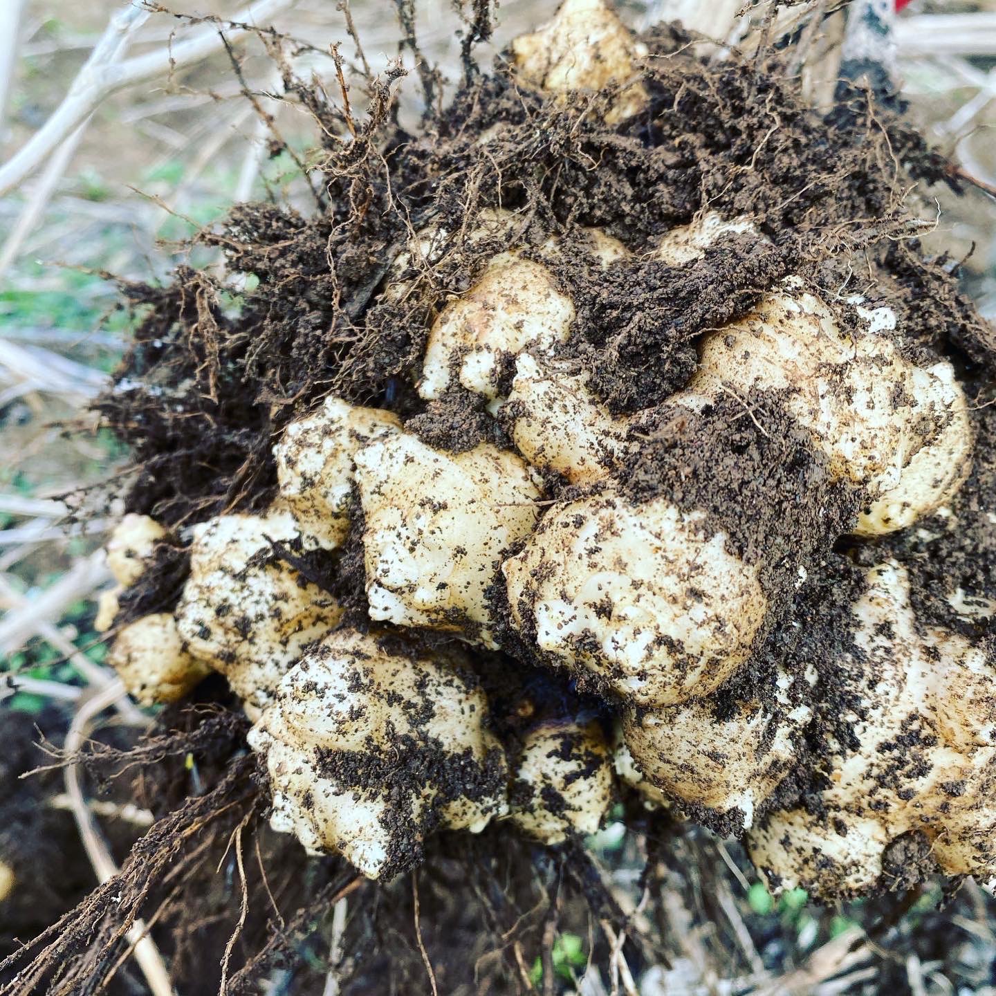 株を引き抜いても #芋 がバラバラと落ちず、株周りにひっついてなかなか離れない面白い株を発見。