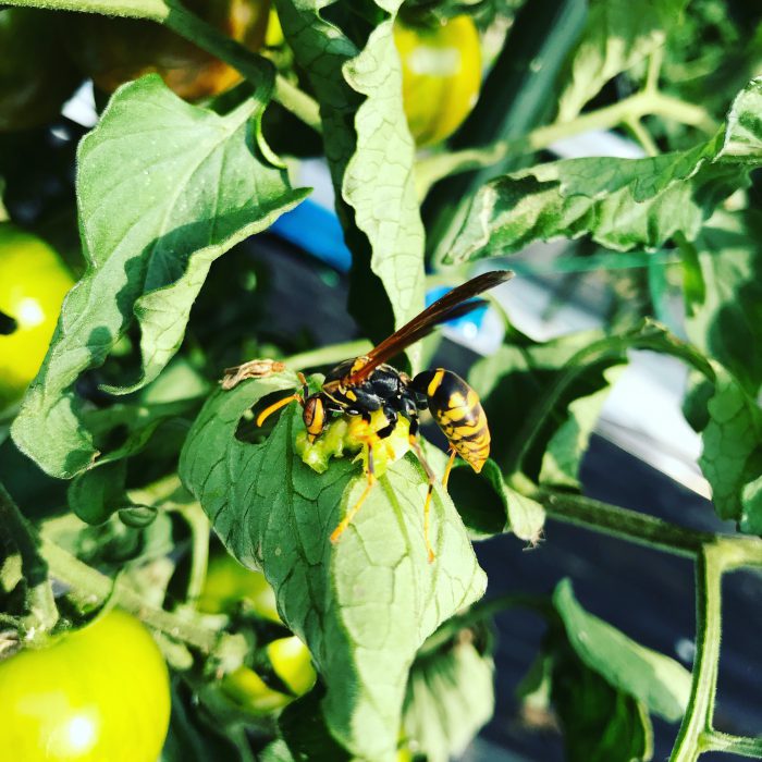 私が収穫中も、葉かき中も、誘引中も、私のかなり近くまで飛んできて、なんならすぐ隣で仕事をしている。
